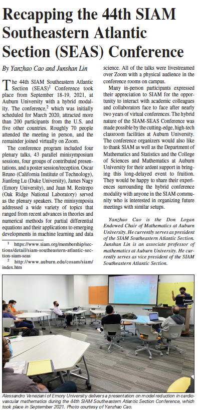 Recapping the 44th SIAM Southeastern Atlantic Section ConferenceThe 44th SIAM Southeastern Atlantic Section (SEAS) Conference took place from September 18-19, 2021, at Auburn University with a hybrid modality. The conference, which was initially scheduled for March 2020, attracted more than 200 participants from the U.S. and five other countries. Roughly 70 people attended the meeting in person, and the remainder joined virtually on Zoom.