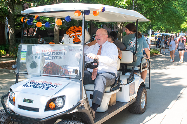 President Roberts surprises students with ride to class for first day of fall semesterTo kick off the first day of fall semester, Auburn University President Christopher B. Roberts spent the morning giving students a ride to and from their classes. From Haley Concourse to Foy Hall and other surrounding campus destinations, Roberts welcomed students back to campus with Aubie as a special guest.