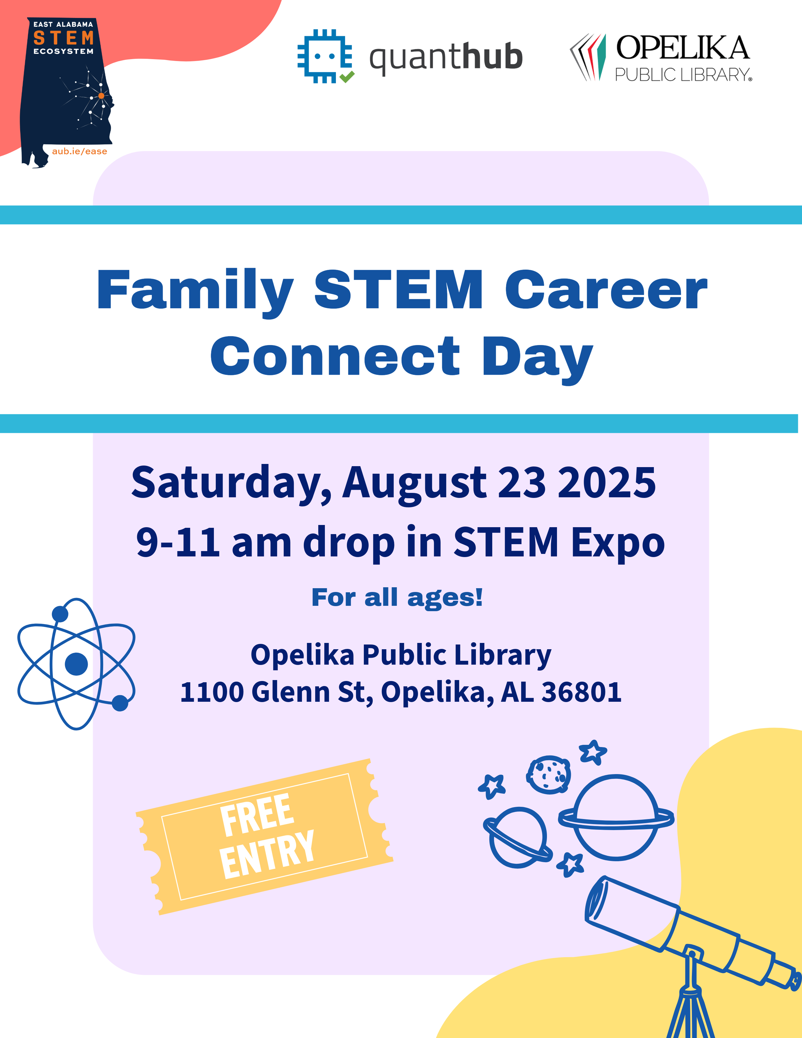 Founded in 2024, the East Alabama STEM Ecosystem is a collection of like-minded partners preparing all learners to thrive through high-quality science, technology, engineering, and math (STEM) experiences. The Auburn University I-STEM Connectory serves as our anchor organization and provides support, guidance, and resources. The East Alabama STEM Ecosystem is part of a global collection of STEM Learning Ecosystems.