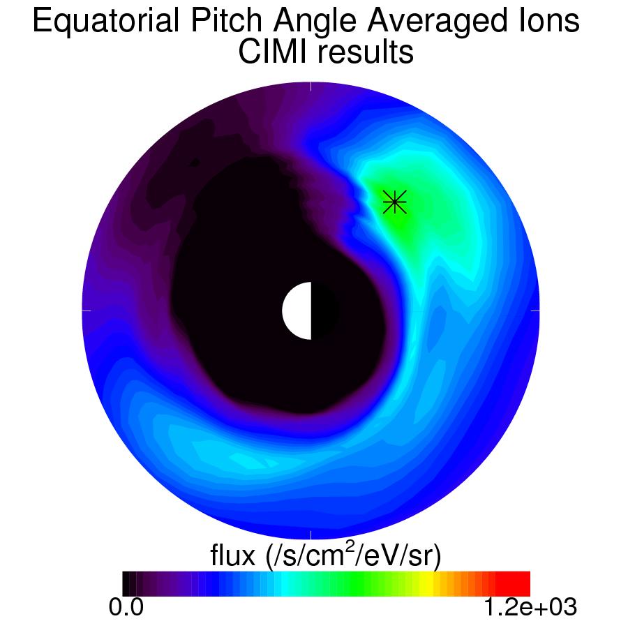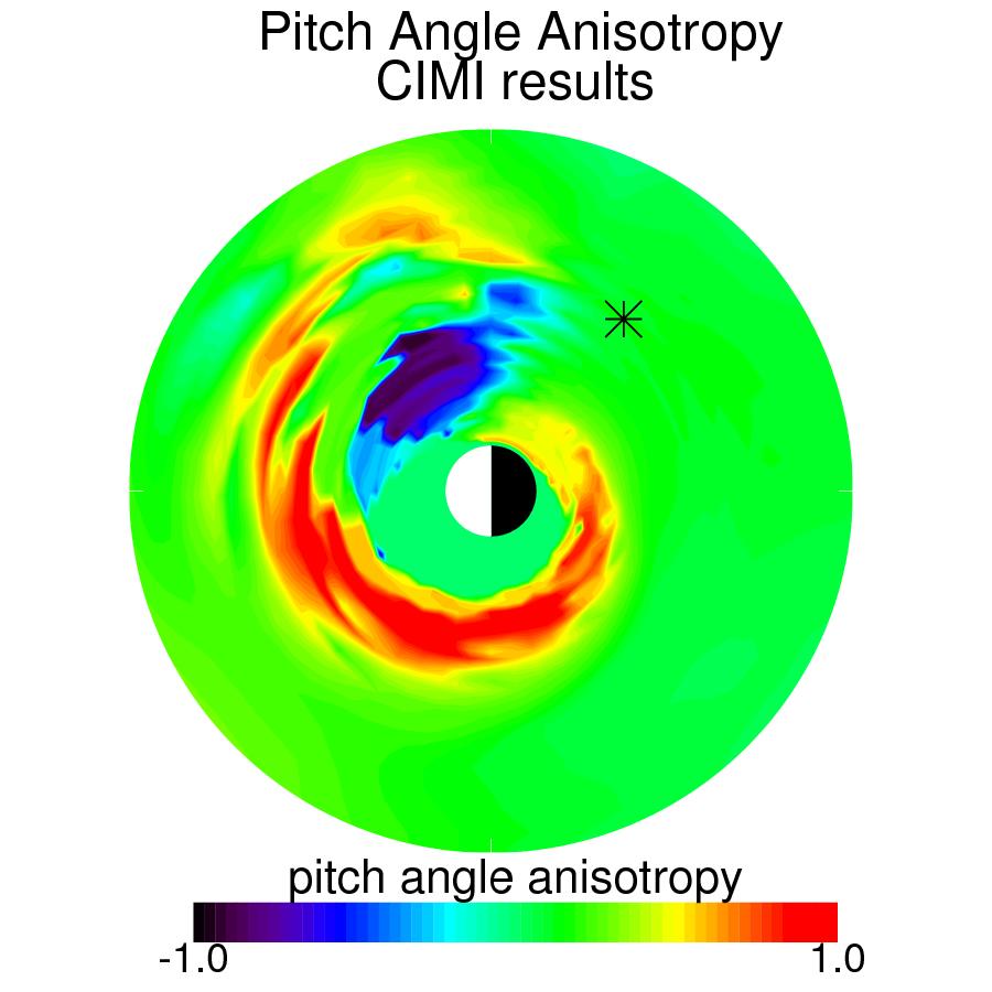 | CIMI Simulated H+ Equatorial Pressure and Pitch-Angle Anistropy | CIMI Simulated H+ Energy and Pitch-Angle Distribution at Pressure Peak | ||