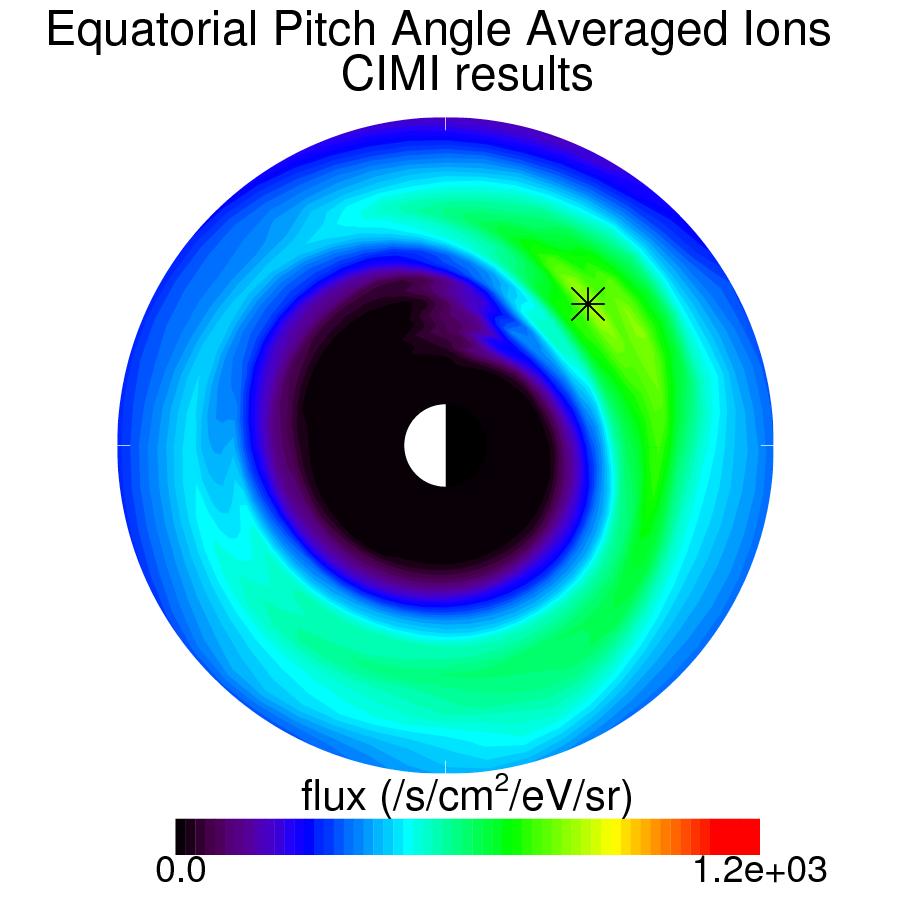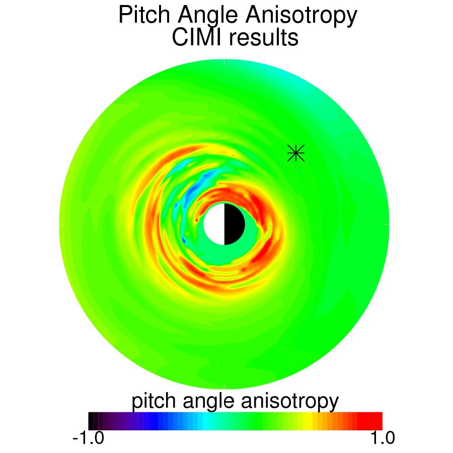 | CIMI Simulated H+ Equatorial Pressure and Pitch-Angle Anistropy | CIMI Simulated H+ Energy and Pitch-Angle Distribution at Pressure Peak | ||