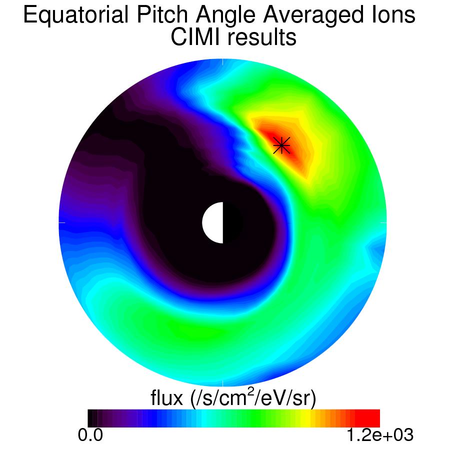 | CIMI Simulated H+ Equatorial Pressure and Pitch-Angle Anistropy | CIMI Simulated H+ Energy and Pitch-Angle Distribution at Pressure Peak | ||