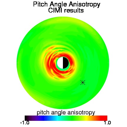 | CIMI Simulated H+ Equatorial Pressure and Pitch-Angle Anistropy | CIMI Simulated H+ Energy and Pitch-Angle Distribution at Pressure Peak | ||